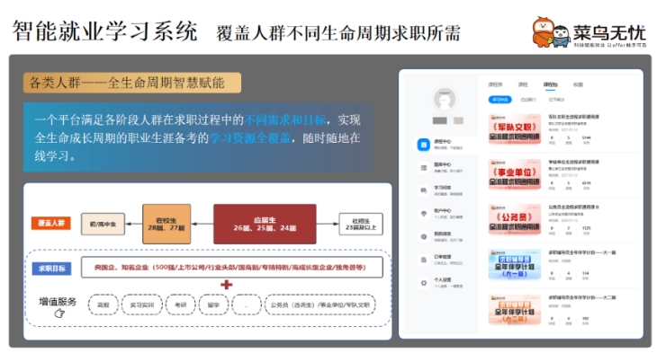 求职是一场 “多环节战役”,从简历优化到面试准备,每一步都需要专业支撑。菜鸟无忧打造的智能工具矩阵,菜鸟无忧AI智慧就业平台,从AI选岗系统到智慧学习平台,专业导师系统,如同为求职者配备了 “全流程作战装备”,提升每一环的竞争力。全流程覆盖求职全过程精准赋能高质量就业。